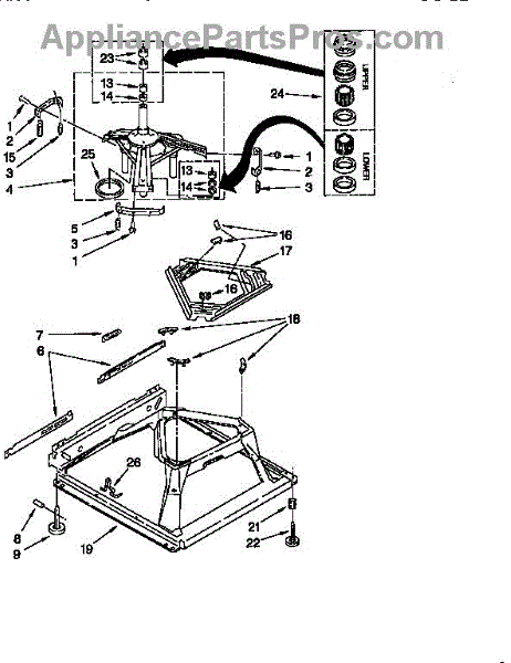 Used for direct drive washing machines. Complete assembly includes 2 level mechanism links, 1 level mechanism spring, 1 knurled pin, 2 rear feet, 1 pad plate, 1 suspension plate, 1 base pad, and 1 suspension spring retainer.