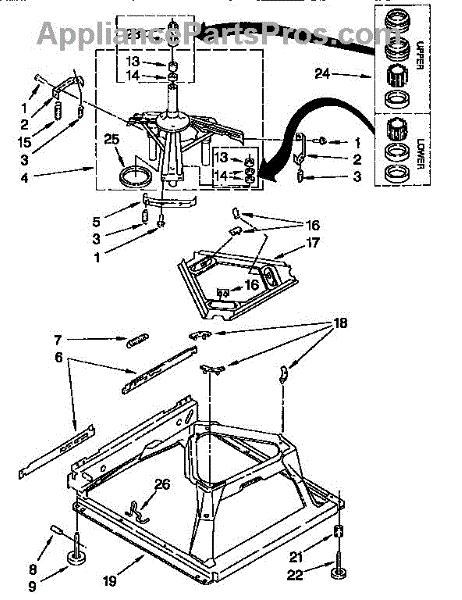 Used for direct drive washing machines. Complete assembly includes 2 level mechanism links, 1 level mechanism spring, 1 knurled pin, 2 rear feet, 1 pad plate, 1 suspension plate, 1 base pad, and 1 suspension spring retainer.