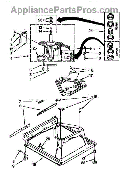 Used for direct drive washing machines. Complete assembly includes 2 level mechanism links, 1 level mechanism spring, 1 knurled pin, 2 rear feet, 1 pad plate, 1 suspension plate, 1 base pad, and 1 suspension spring retainer.