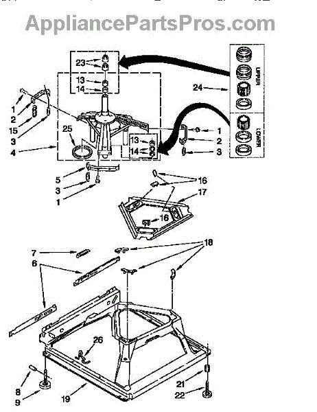 Used for direct drive washing machines. Complete assembly includes 2 level mechanism links, 1 level mechanism spring, 1 knurled pin, 2 rear feet, 1 pad plate, 1 suspension plate, 1 base pad, and 1 suspension spring retainer.