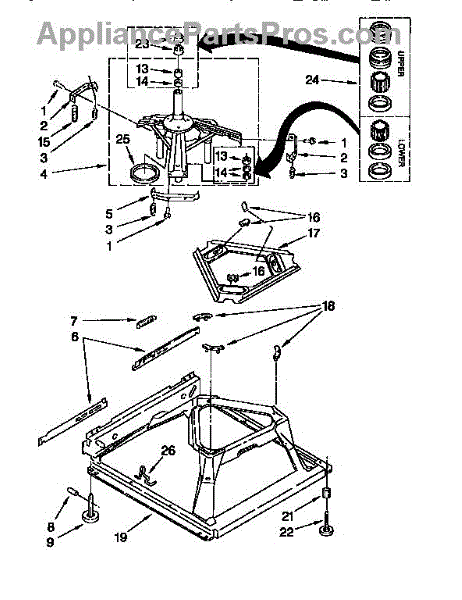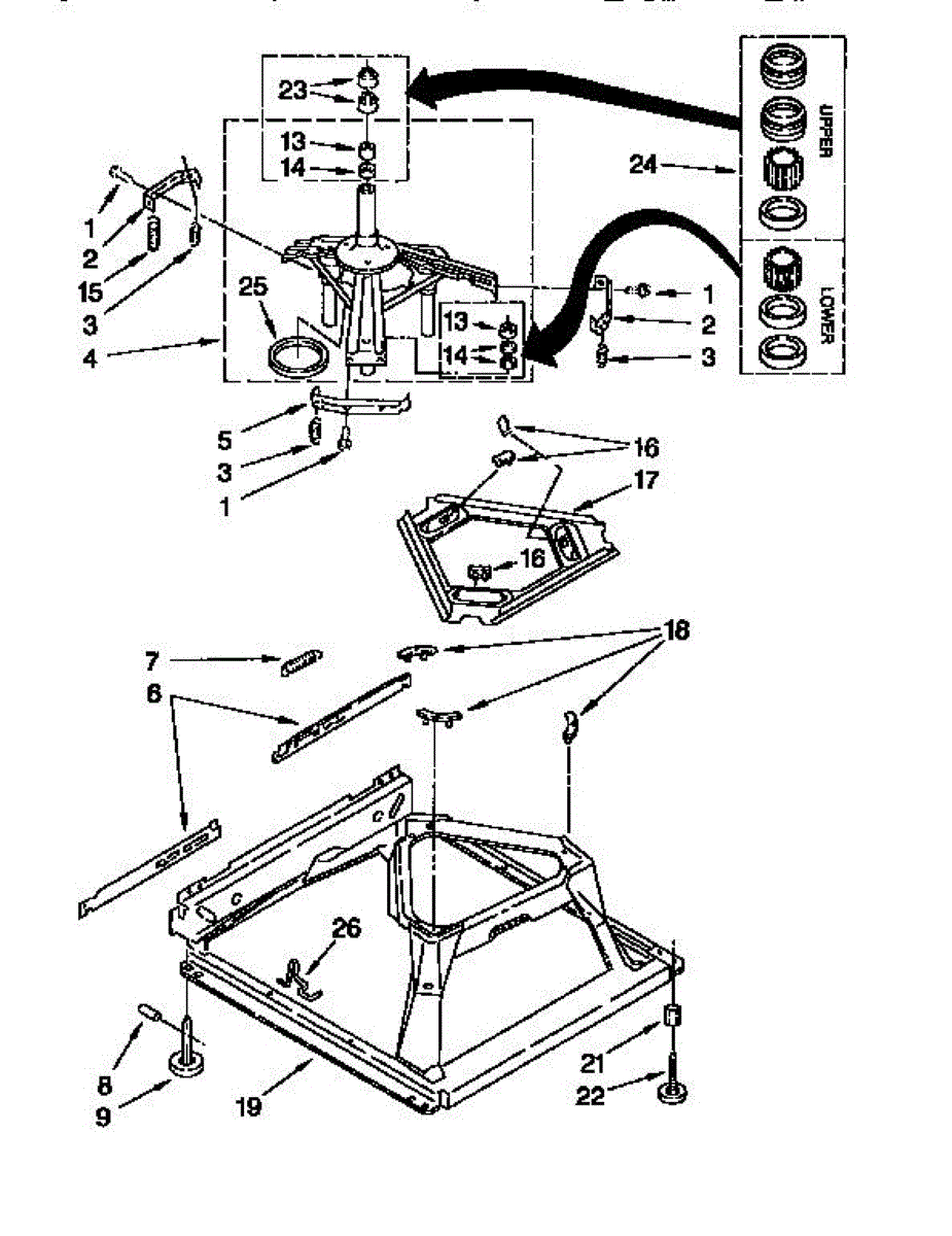 Used for direct drive washing machines. Complete assembly includes 2 level mechanism links, 1 level mechanism spring, 1 knurled pin, 2 rear feet, 1 pad plate, 1 suspension plate, 1 base pad, and 1 suspension spring retainer.