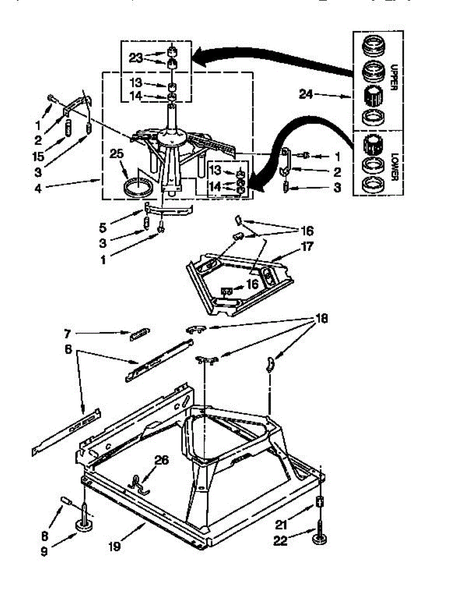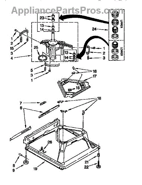 Used for direct drive washing machines. Complete assembly includes 2 level mechanism links, 1 level mechanism spring, 1 knurled pin, 2 rear feet, 1 pad plate, 1 suspension plate, 1 base pad, and 1 suspension spring retainer.