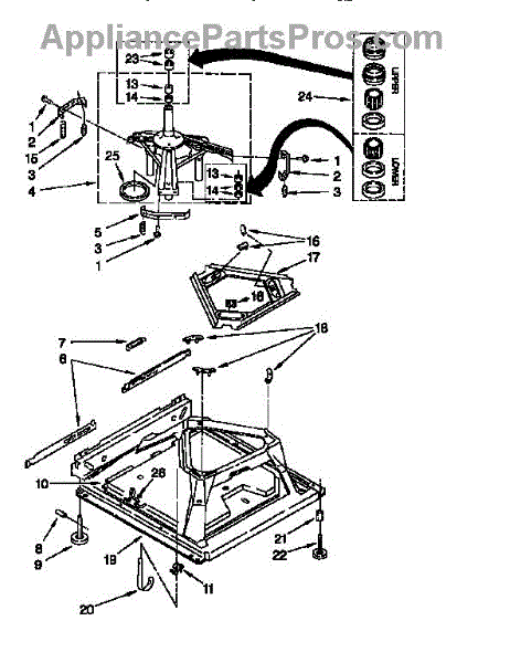 Secures suspension springs at the washer base to absorb vibrations. Replace if cracked, worn, or broken to restore proper drum stabilization.