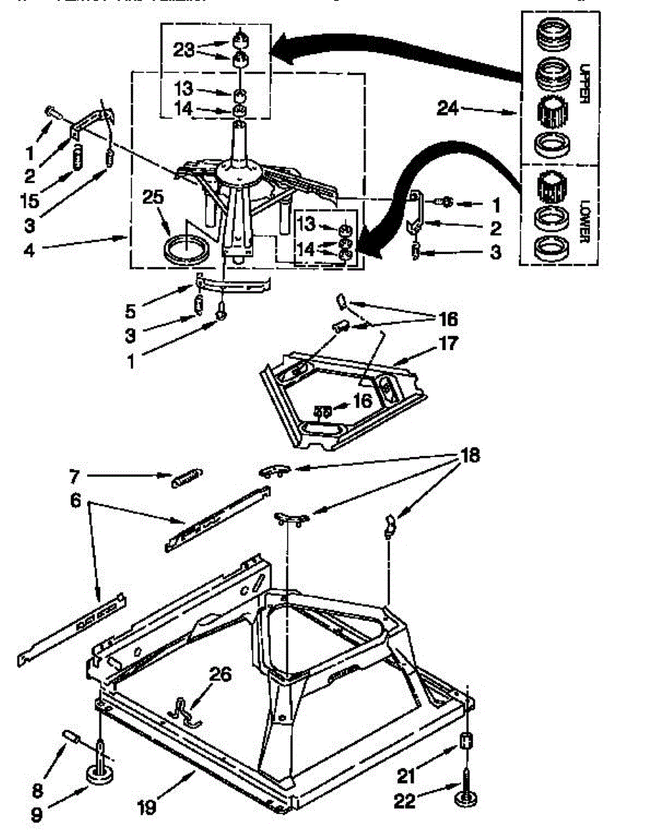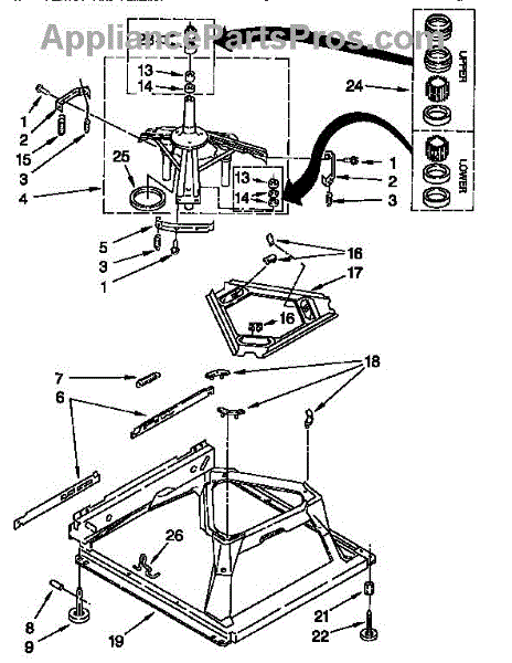 Used for direct drive washing machines. Complete assembly includes 2 level mechanism links, 1 level mechanism spring, 1 knurled pin, 2 rear feet, 1 pad plate, 1 suspension plate, 1 base pad, and 1 suspension spring retainer.