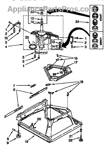 Used for direct drive washing machines. Complete assembly includes 2 level mechanism links, 1 level mechanism spring, 1 knurled pin, 2 rear feet, 1 pad plate, 1 suspension plate, 1 base pad, and 1 suspension spring retainer.