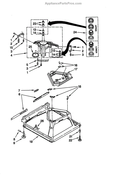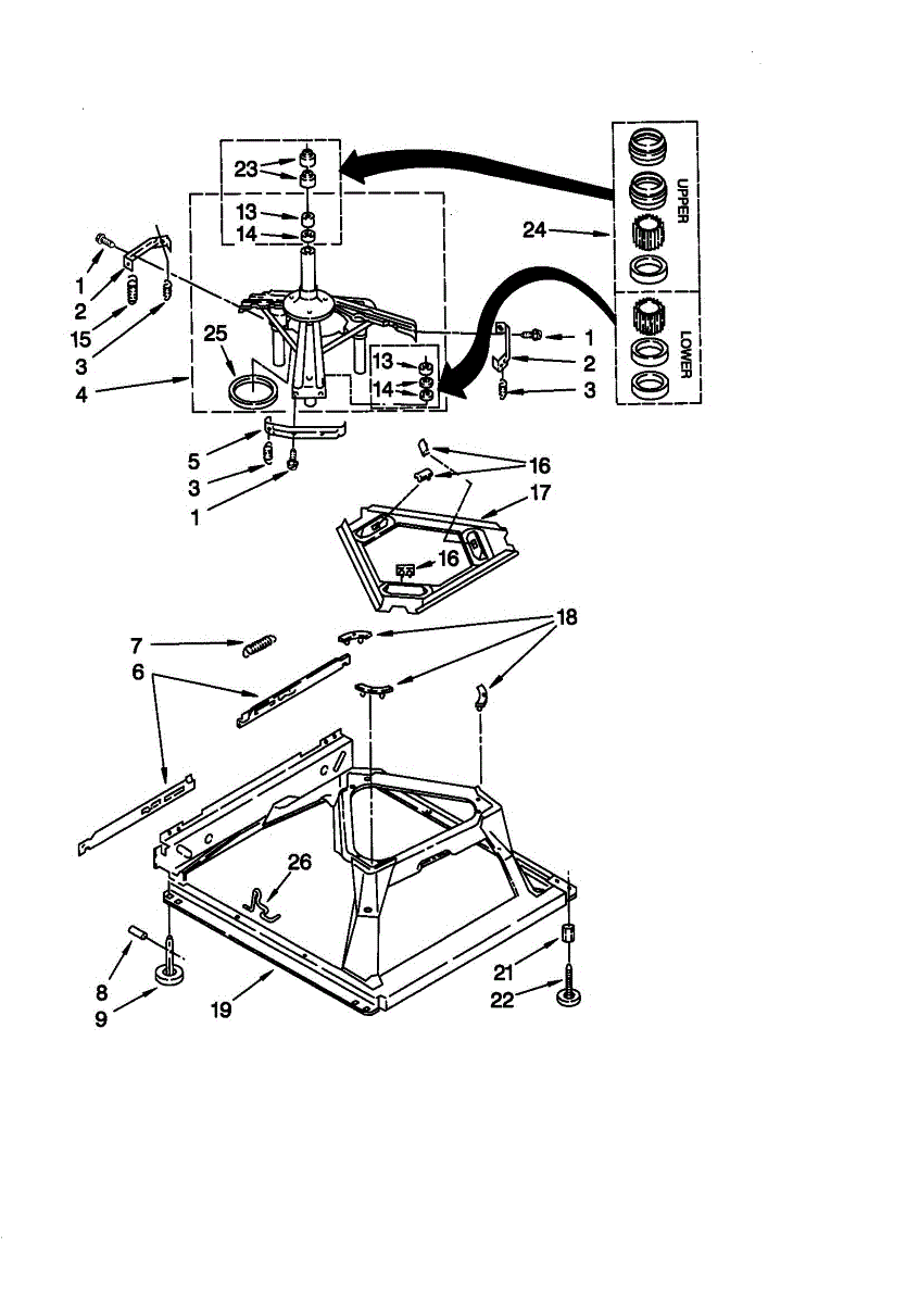 Used for direct drive washing machines. Complete assembly includes 2 level mechanism links, 1 level mechanism spring, 1 knurled pin, 2 rear feet, 1 pad plate, 1 suspension plate, 1 base pad, and 1 suspension spring retainer.