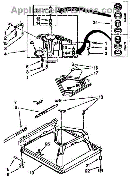 Used for direct drive washing machines. Complete assembly includes 2 level mechanism links, 1 level mechanism spring, 1 knurled pin, 2 rear feet, 1 pad plate, 1 suspension plate, 1 base pad, and 1 suspension spring retainer.