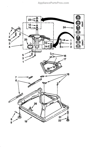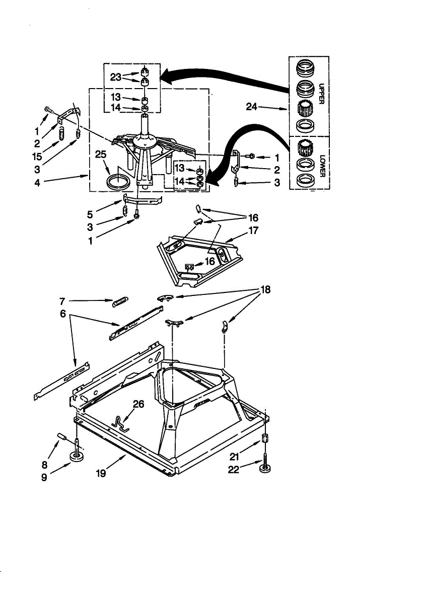 Used for direct drive washing machines. Complete assembly includes 2 level mechanism links, 1 level mechanism spring, 1 knurled pin, 2 rear feet, 1 pad plate, 1 suspension plate, 1 base pad, and 1 suspension spring retainer.