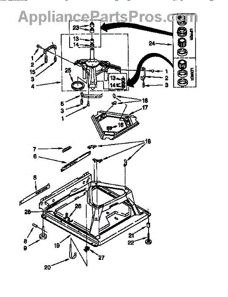 Used for direct drive washing machines. Complete assembly includes 2 level mechanism links, 1 level mechanism spring, 1 knurled pin, 2 rear feet, 1 pad plate, 1 suspension plate, 1 base pad, and 1 suspension spring retainer.
