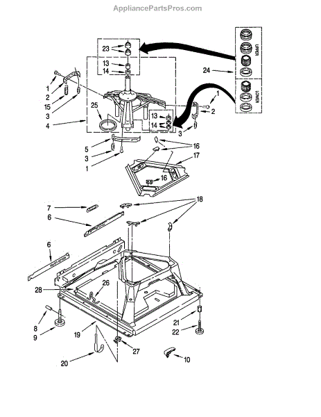 Used for direct drive washing machines. Complete assembly includes 2 level mechanism links, 1 level mechanism spring, 1 knurled pin, 2 rear feet, 1 pad plate, 1 suspension plate, 1 base pad, and 1 suspension spring retainer.