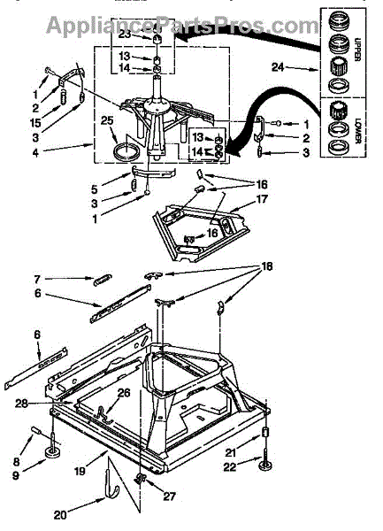 Used for direct drive washing machines. Complete assembly includes 2 level mechanism links, 1 level mechanism spring, 1 knurled pin, 2 rear feet, 1 pad plate, 1 suspension plate, 1 base pad, and 1 suspension spring retainer.