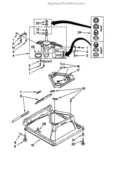 Used for direct drive washing machines. Complete assembly includes 2 level mechanism links, 1 level mechanism spring, 1 knurled pin, 2 rear feet, 1 pad plate, 1 suspension plate, 1 base pad, and 1 suspension spring retainer.
