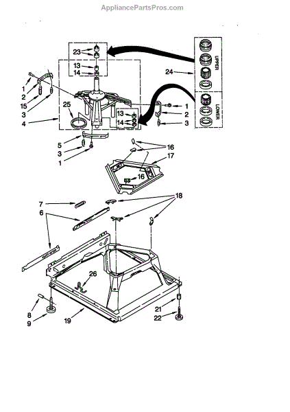 Used for direct drive washing machines. Complete assembly includes 2 level mechanism links, 1 level mechanism spring, 1 knurled pin, 2 rear feet, 1 pad plate, 1 suspension plate, 1 base pad, and 1 suspension spring retainer.