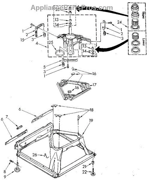 Secures suspension springs to the washer tub assembly. Replace if cracked, worn, or missing to prevent tub instability during wash and spin cycles.