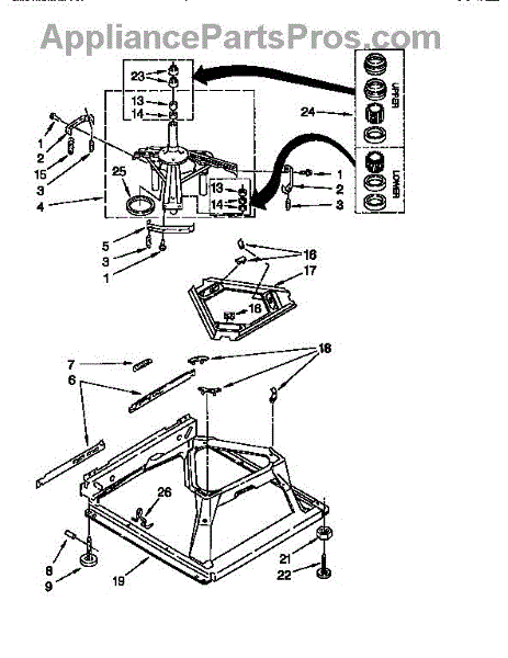 Used for direct drive washing machines. Complete assembly includes 2 level mechanism links, 1 level mechanism spring, 1 knurled pin, 2 rear feet, 1 pad plate, 1 suspension plate, 1 base pad, and 1 suspension spring retainer.