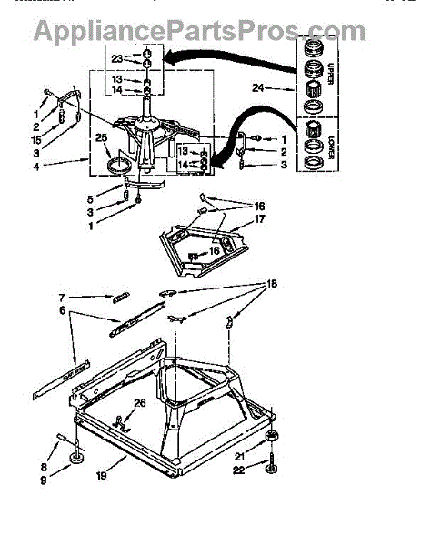 Used for direct drive washing machines. Complete assembly includes 2 level mechanism links, 1 level mechanism spring, 1 knurled pin, 2 rear feet, 1 pad plate, 1 suspension plate, 1 base pad, and 1 suspension spring retainer.