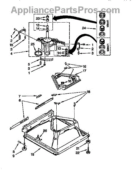 Used for direct drive washing machines. Complete assembly includes 2 level mechanism links, 1 level mechanism spring, 1 knurled pin, 2 rear feet, 1 pad plate, 1 suspension plate, 1 base pad, and 1 suspension spring retainer.