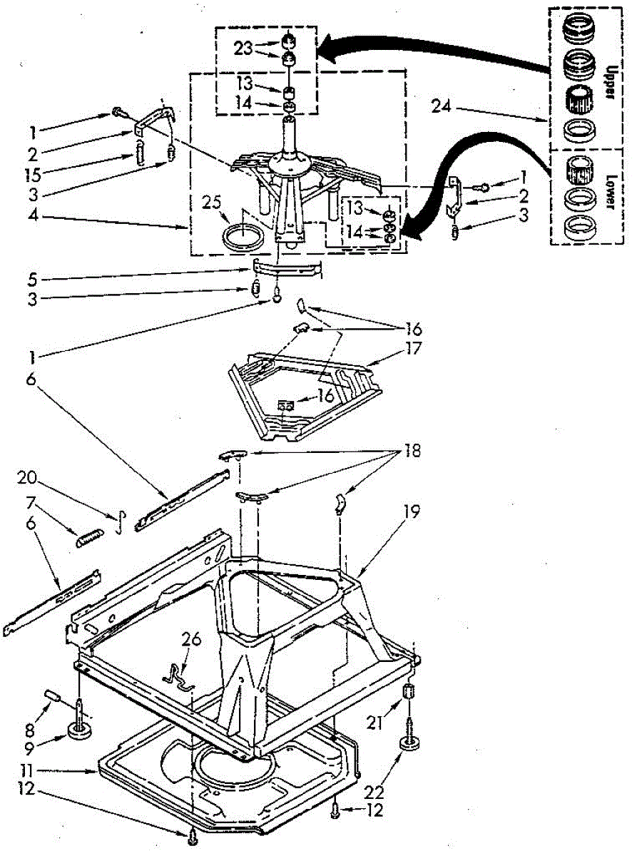 Used for direct drive washing machines. Complete assembly includes 2 level mechanism links, 1 level mechanism spring, 1 knurled pin, 2 rear feet, 1 pad plate, 1 suspension plate, 1 base pad, and 1 suspension spring retainer.