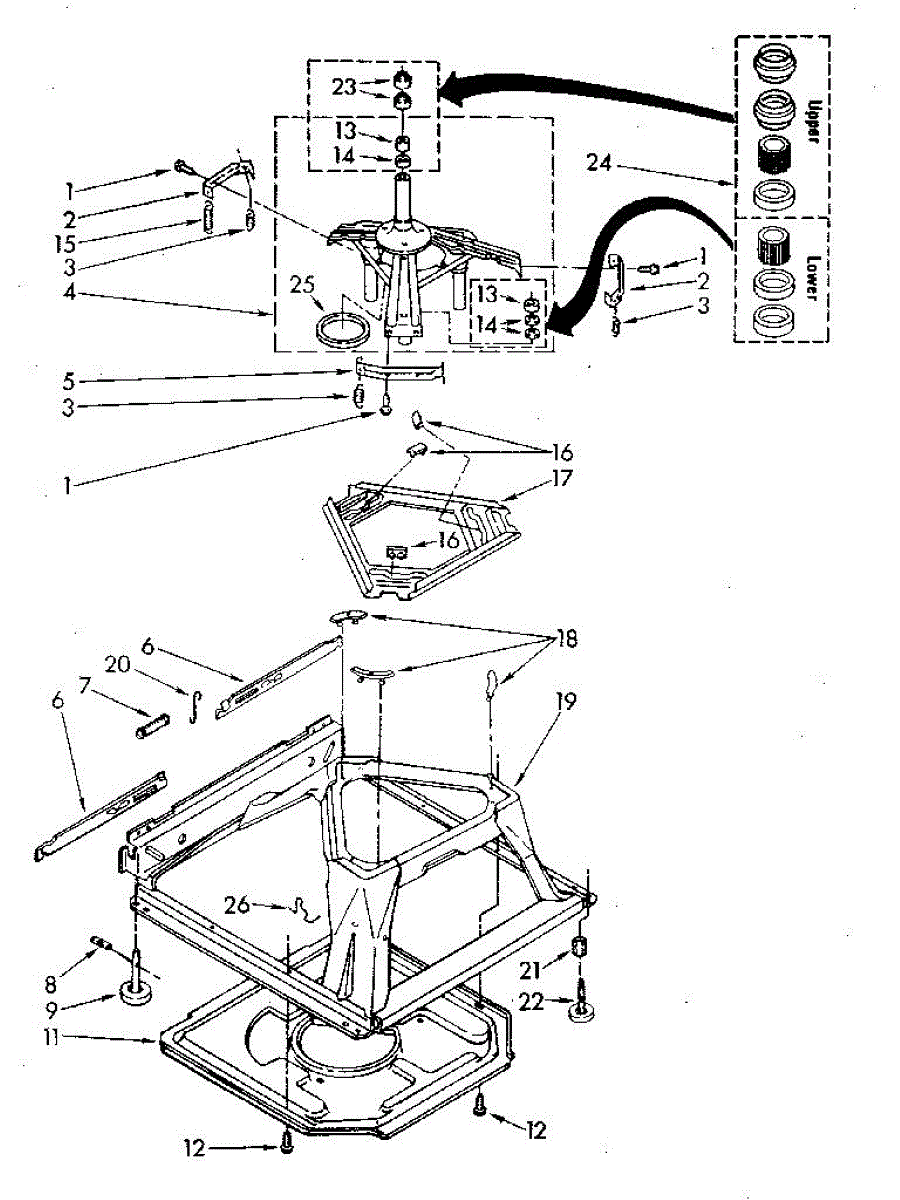 Used for direct drive washing machines. Complete assembly includes 2 level mechanism links, 1 level mechanism spring, 1 knurled pin, 2 rear feet, 1 pad plate, 1 suspension plate, 1 base pad, and 1 suspension spring retainer.