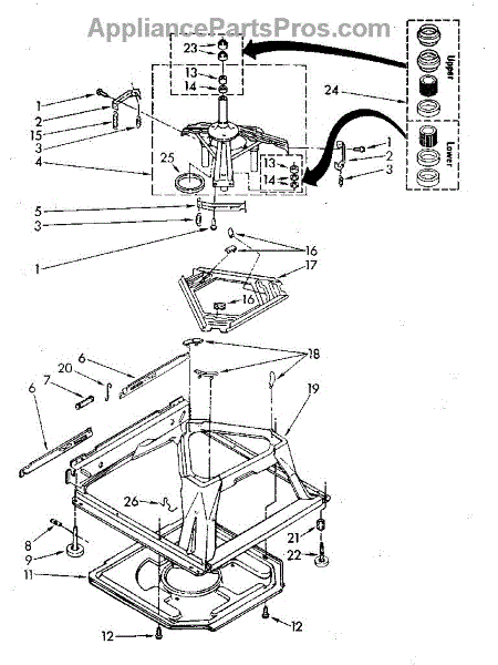 Used for direct drive washing machines. Complete assembly includes 2 level mechanism links, 1 level mechanism spring, 1 knurled pin, 2 rear feet, 1 pad plate, 1 suspension plate, 1 base pad, and 1 suspension spring retainer.