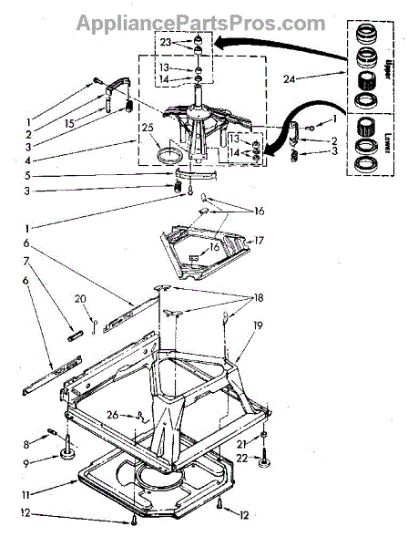 Used for direct drive washing machines. Complete assembly includes 2 level mechanism links, 1 level mechanism spring, 1 knurled pin, 2 rear feet, 1 pad plate, 1 suspension plate, 1 base pad, and 1 suspension spring retainer.