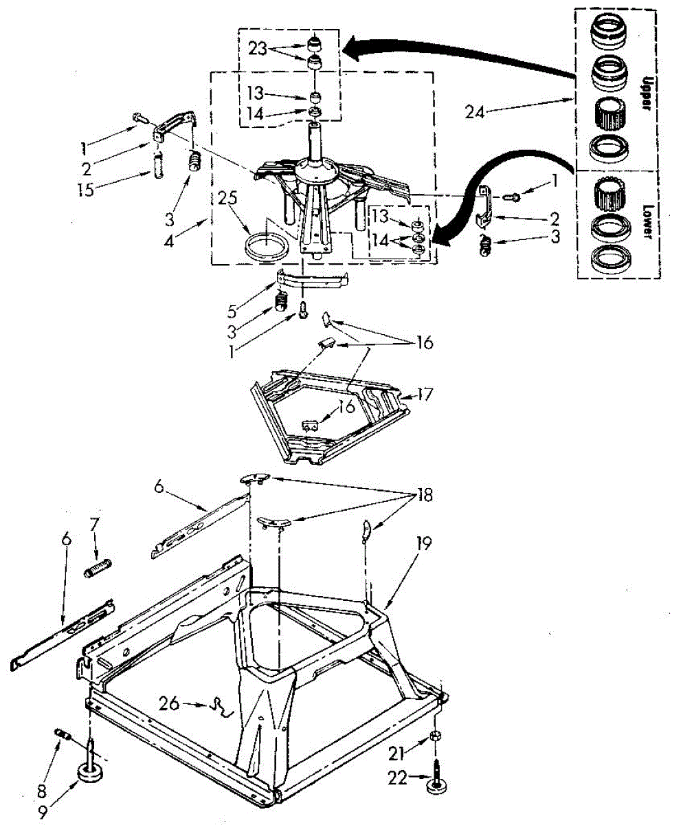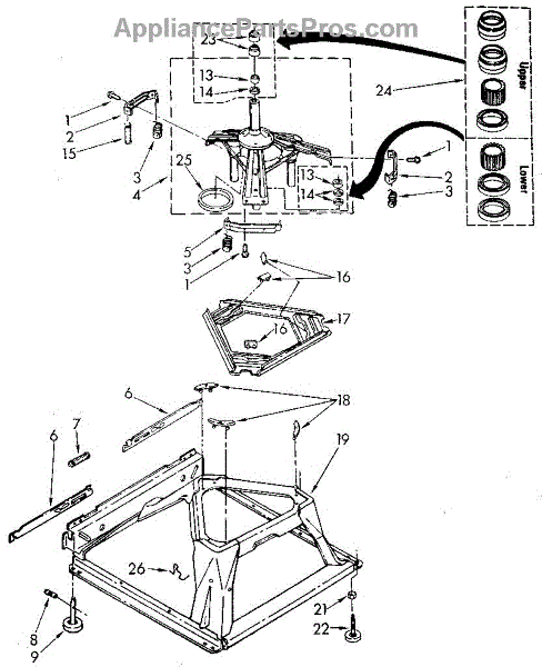 Used for direct drive washing machines. Complete assembly includes 2 level mechanism links, 1 level mechanism spring, 1 knurled pin, 2 rear feet, 1 pad plate, 1 suspension plate, 1 base pad, and 1 suspension spring retainer.