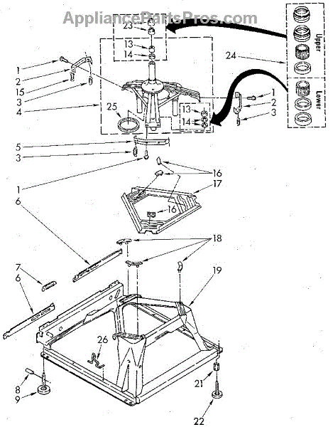 Used for direct drive washing machines. Complete assembly includes 2 level mechanism links, 1 level mechanism spring, 1 knurled pin, 2 rear feet, 1 pad plate, 1 suspension plate, 1 base pad, and 1 suspension spring retainer.