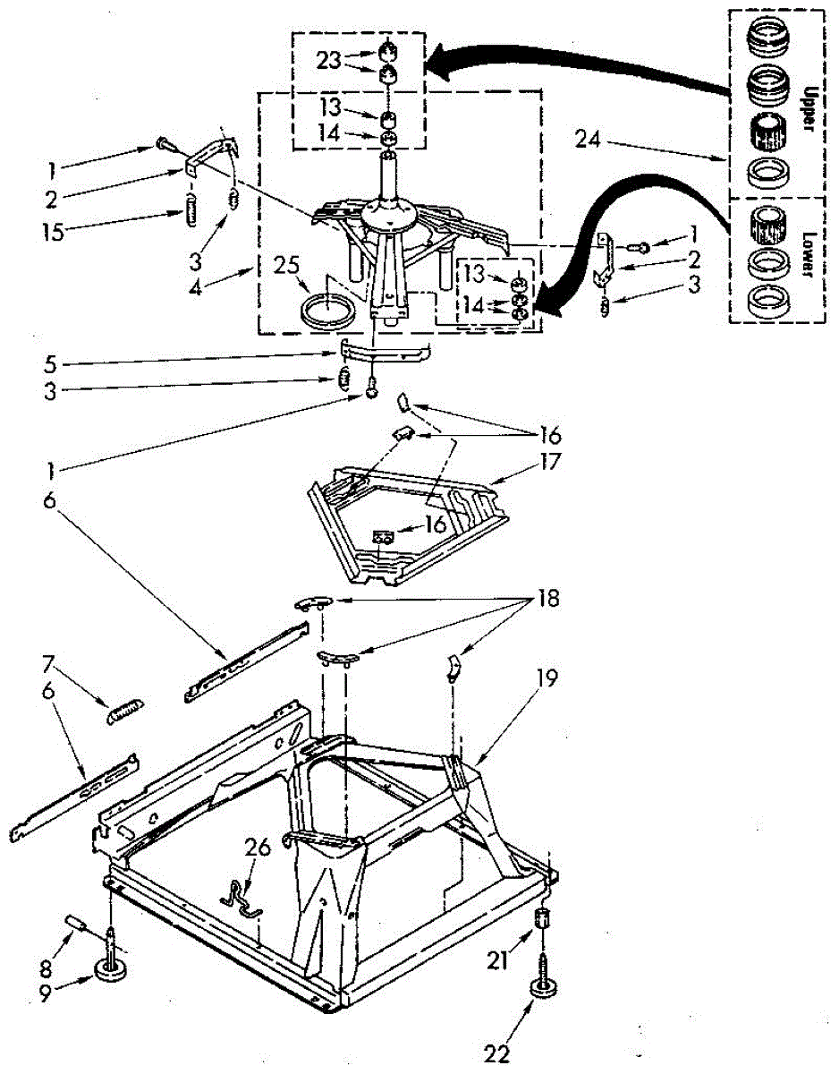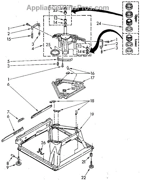 Used for direct drive washing machines. Complete assembly includes 2 level mechanism links, 1 level mechanism spring, 1 knurled pin, 2 rear feet, 1 pad plate, 1 suspension plate, 1 base pad, and 1 suspension spring retainer.