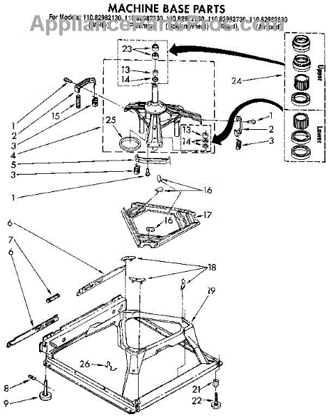 Used for direct drive washing machines. Complete assembly includes 2 level mechanism links, 1 level mechanism spring, 1 knurled pin, 2 rear feet, 1 pad plate, 1 suspension plate, 1 base pad, and 1 suspension spring retainer.