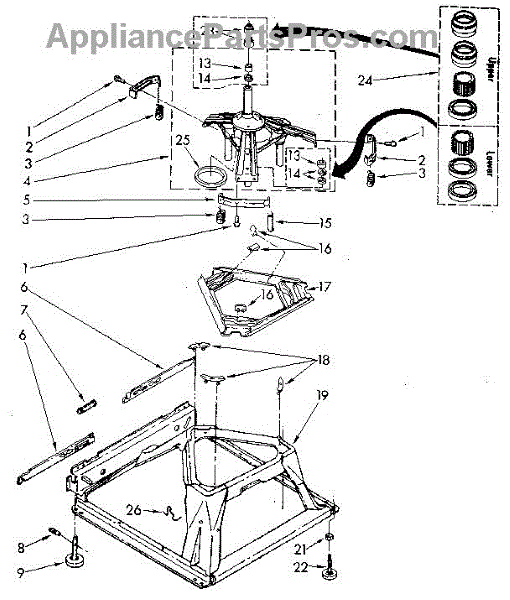 Used for direct drive washing machines. Complete assembly includes 2 level mechanism links, 1 level mechanism spring, 1 knurled pin, 2 rear feet, 1 pad plate, 1 suspension plate, 1 base pad, and 1 suspension spring retainer.