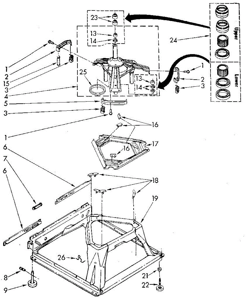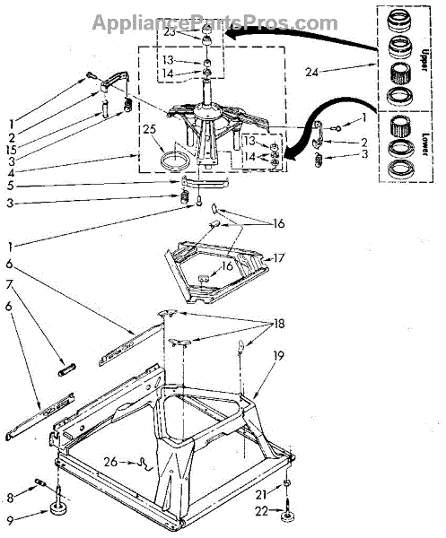 Used for direct drive washing machines. Complete assembly includes 2 level mechanism links, 1 level mechanism spring, 1 knurled pin, 2 rear feet, 1 pad plate, 1 suspension plate, 1 base pad, and 1 suspension spring retainer.