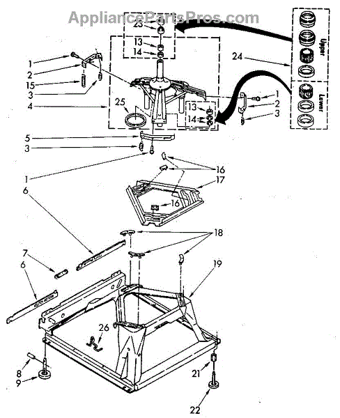 Used for direct drive washing machines. Complete assembly includes 2 level mechanism links, 1 level mechanism spring, 1 knurled pin, 2 rear feet, 1 pad plate, 1 suspension plate, 1 base pad, and 1 suspension spring retainer.