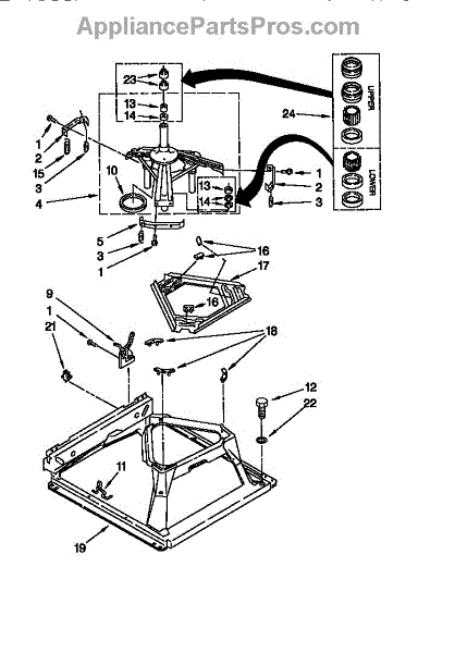 Secures suspension springs at the washer base to absorb vibrations. Replace if cracked, worn, or broken to restore proper drum stabilization.