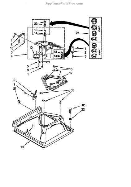 Secures suspension springs at the washer base to absorb vibrations. Replace if cracked, worn, or broken to restore proper drum stabilization.