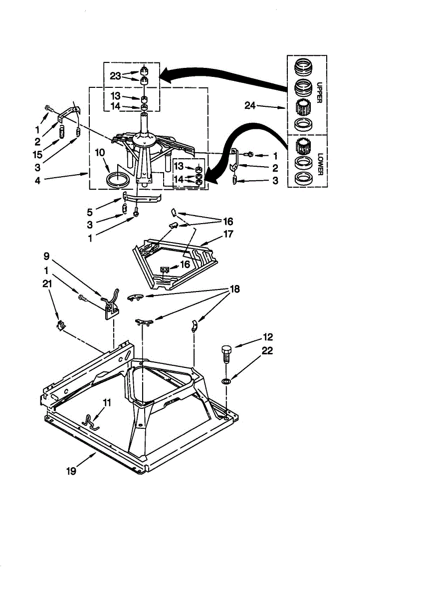 Secures suspension springs to the washer tub assembly. Replace if cracked, worn, or missing to prevent tub instability during wash and spin cycles.