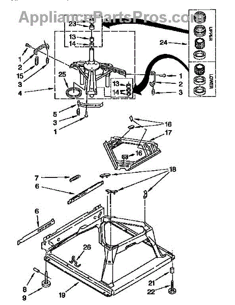Secures suspension springs to the washer tub assembly. Replace if cracked, worn, or missing to prevent tub instability during wash and spin cycles.