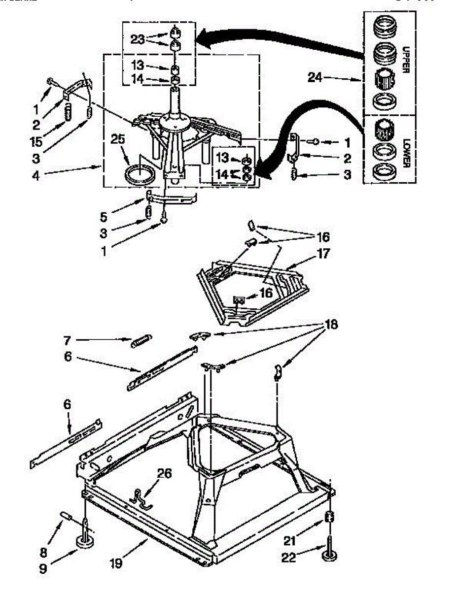 Used for direct drive washing machines. Complete assembly includes 2 level mechanism links, 1 level mechanism spring, 1 knurled pin, 2 rear feet, 1 pad plate, 1 suspension plate, 1 base pad, and 1 suspension spring retainer.