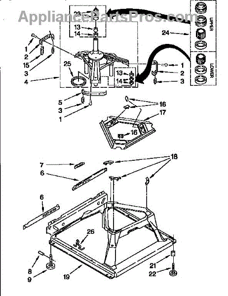 Used for direct drive washing machines. Complete assembly includes 2 level mechanism links, 1 level mechanism spring, 1 knurled pin, 2 rear feet, 1 pad plate, 1 suspension plate, 1 base pad, and 1 suspension spring retainer.