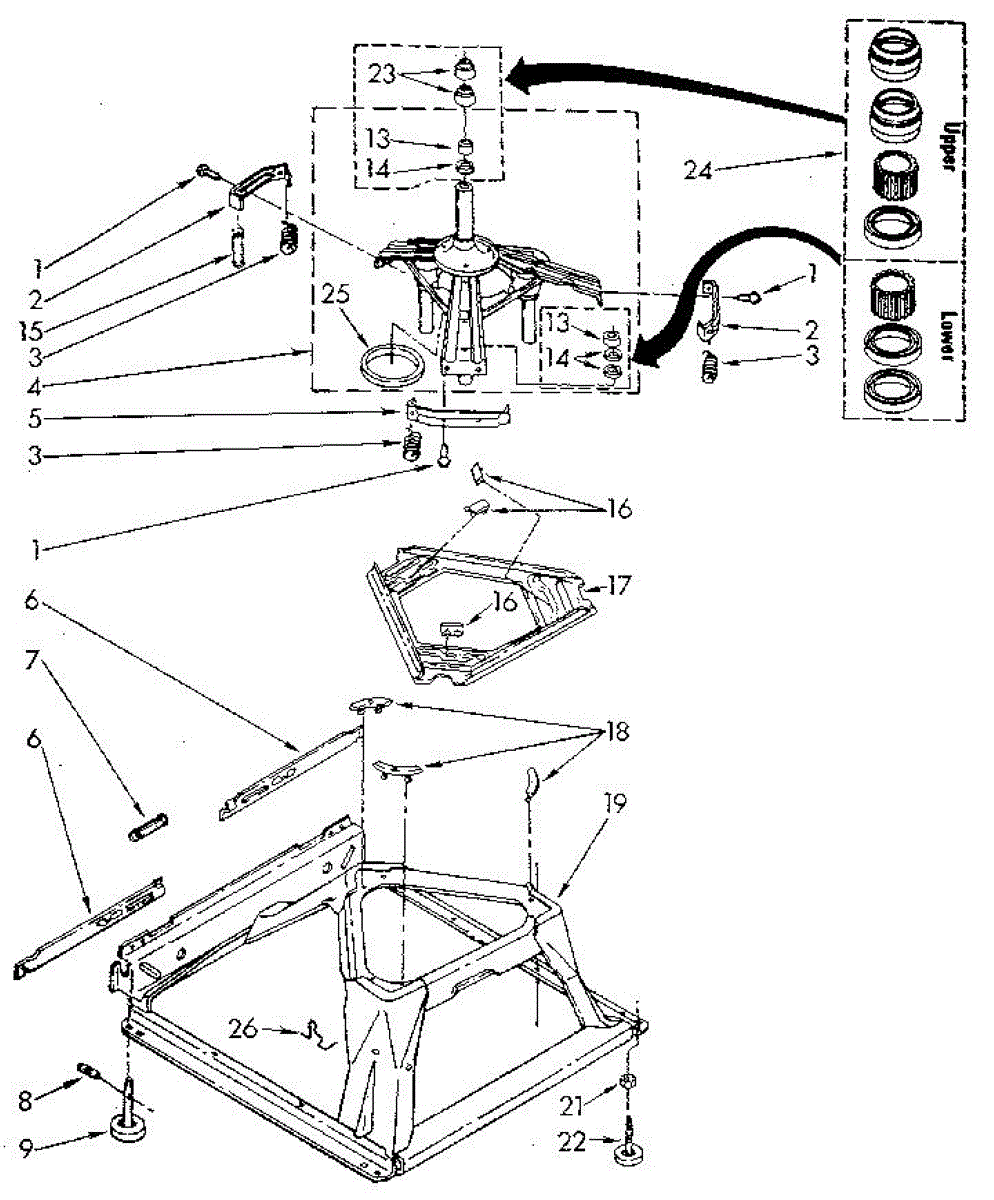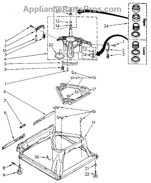 Used for direct drive washing machines. Complete assembly includes 2 level mechanism links, 1 level mechanism spring, 1 knurled pin, 2 rear feet, 1 pad plate, 1 suspension plate, 1 base pad, and 1 suspension spring retainer.