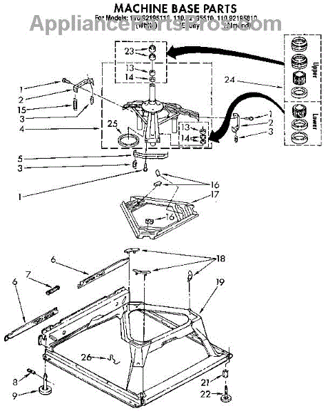 Used for direct drive washing machines. Complete assembly includes 2 level mechanism links, 1 level mechanism spring, 1 knurled pin, 2 rear feet, 1 pad plate, 1 suspension plate, 1 base pad, and 1 suspension spring retainer.