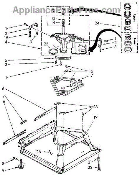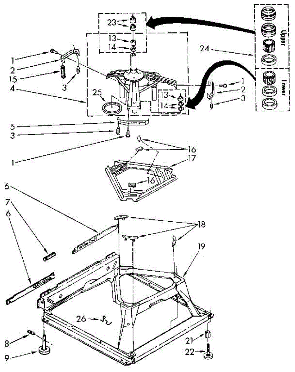 Used for direct drive washing machines. Complete assembly includes 2 level mechanism links, 1 level mechanism spring, 1 knurled pin, 2 rear feet, 1 pad plate, 1 suspension plate, 1 base pad, and 1 suspension spring retainer.