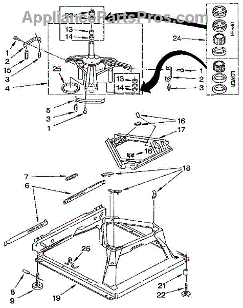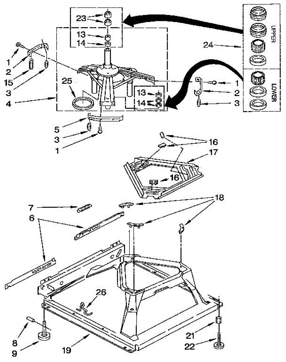 Used for direct drive washing machines. Complete assembly includes 2 level mechanism links, 1 level mechanism spring, 1 knurled pin, 2 rear feet, 1 pad plate, 1 suspension plate, 1 base pad, and 1 suspension spring retainer.