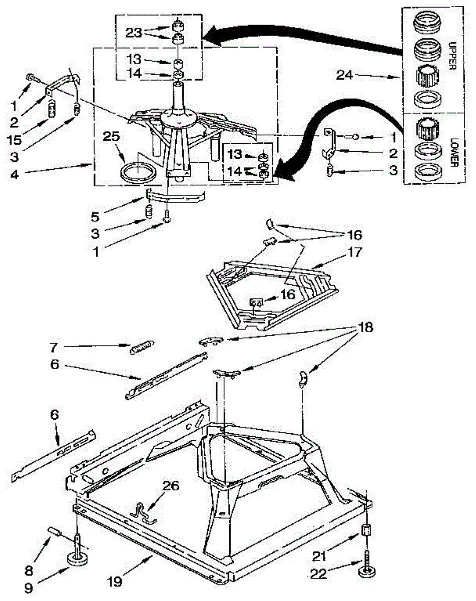 Used for direct drive washing machines. Complete assembly includes 2 level mechanism links, 1 level mechanism spring, 1 knurled pin, 2 rear feet, 1 pad plate, 1 suspension plate, 1 base pad, and 1 suspension spring retainer.