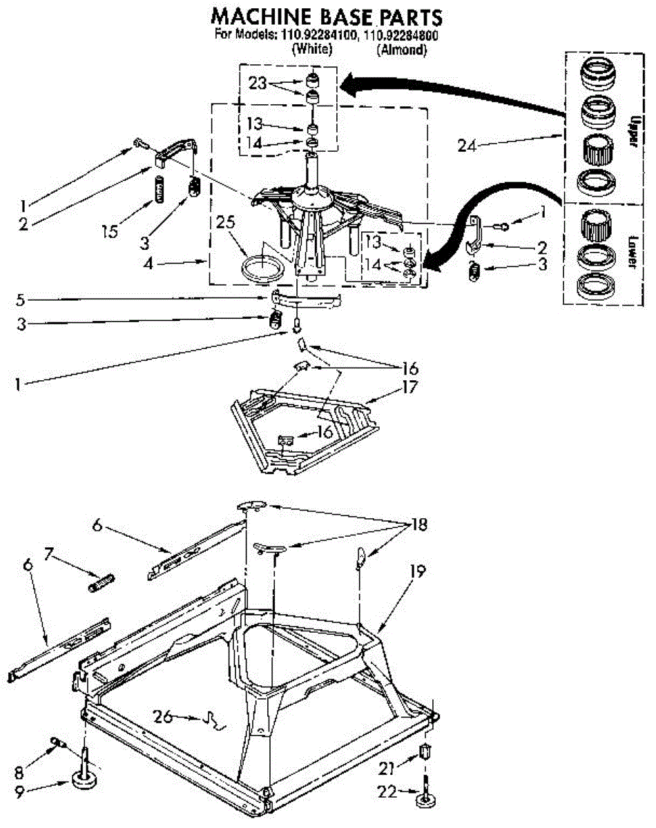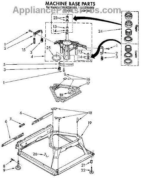 Used for direct drive washing machines. Complete assembly includes 2 level mechanism links, 1 level mechanism spring, 1 knurled pin, 2 rear feet, 1 pad plate, 1 suspension plate, 1 base pad, and 1 suspension spring retainer.