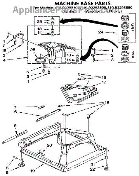 Used for direct drive washing machines. Complete assembly includes 2 level mechanism links, 1 level mechanism spring, 1 knurled pin, 2 rear feet, 1 pad plate, 1 suspension plate, 1 base pad, and 1 suspension spring retainer.
