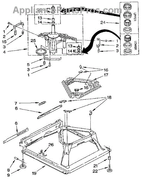 Used for direct drive washing machines. Complete assembly includes 2 level mechanism links, 1 level mechanism spring, 1 knurled pin, 2 rear feet, 1 pad plate, 1 suspension plate, 1 base pad, and 1 suspension spring retainer.