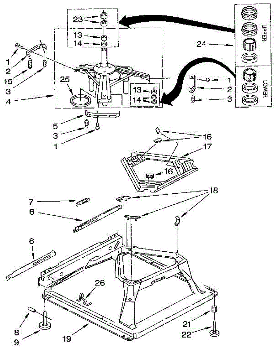Used for direct drive washing machines. Complete assembly includes 2 level mechanism links, 1 level mechanism spring, 1 knurled pin, 2 rear feet, 1 pad plate, 1 suspension plate, 1 base pad, and 1 suspension spring retainer.