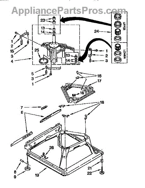 Used for direct drive washing machines. Complete assembly includes 2 level mechanism links, 1 level mechanism spring, 1 knurled pin, 2 rear feet, 1 pad plate, 1 suspension plate, 1 base pad, and 1 suspension spring retainer.