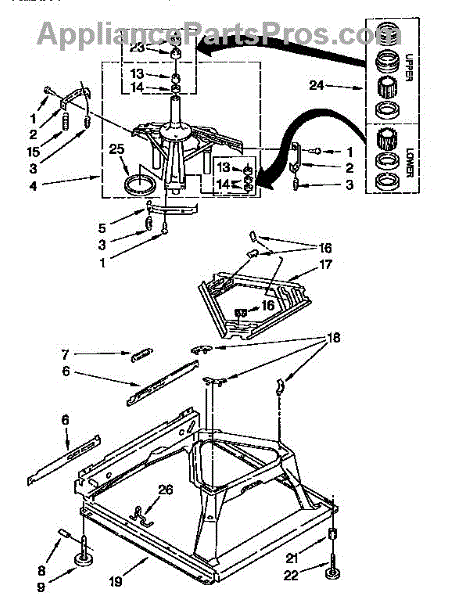 Used for direct drive washing machines. Complete assembly includes 2 level mechanism links, 1 level mechanism spring, 1 knurled pin, 2 rear feet, 1 pad plate, 1 suspension plate, 1 base pad, and 1 suspension spring retainer.