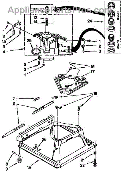 Used for direct drive washing machines. Complete assembly includes 2 level mechanism links, 1 level mechanism spring, 1 knurled pin, 2 rear feet, 1 pad plate, 1 suspension plate, 1 base pad, and 1 suspension spring retainer.
